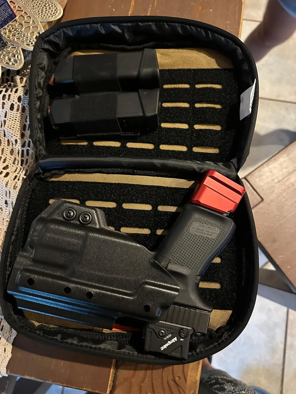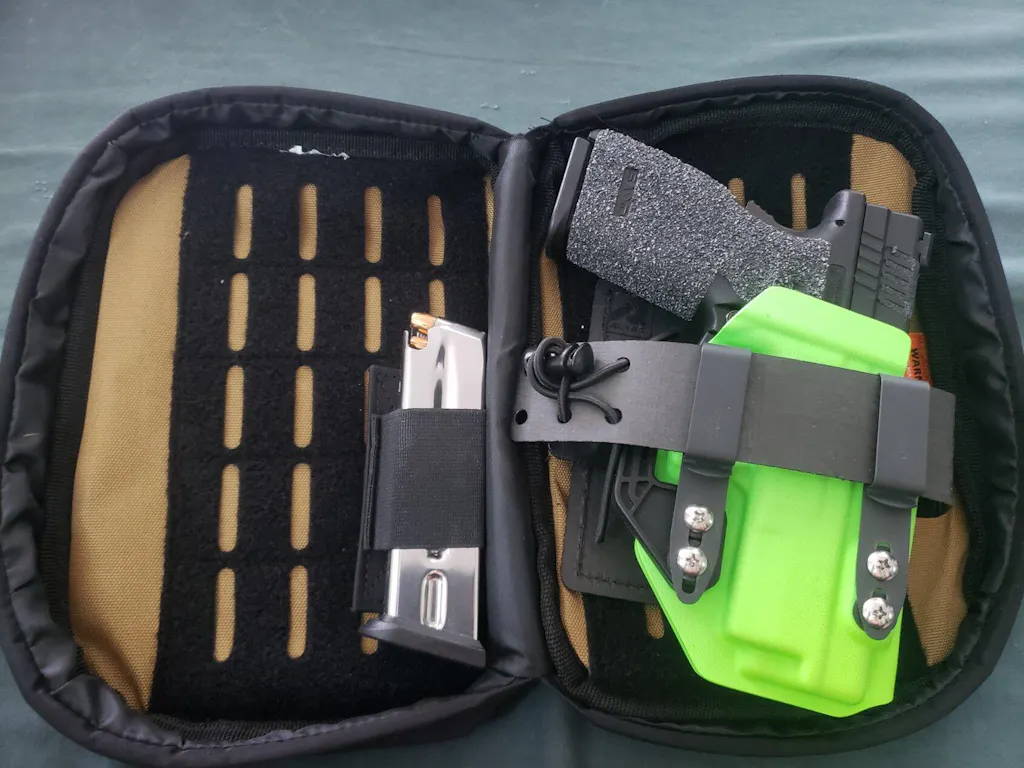 Please see https://grabbaggear.com/products/horus-holster to view our Kydex Horus Holster that is specifically designed for this bag. If you don't see your option with the Horus Holster consider checking out our universal Velcro Holster here https://grabbaggear.com/products/grab-universal-holster?variant=51465409724730